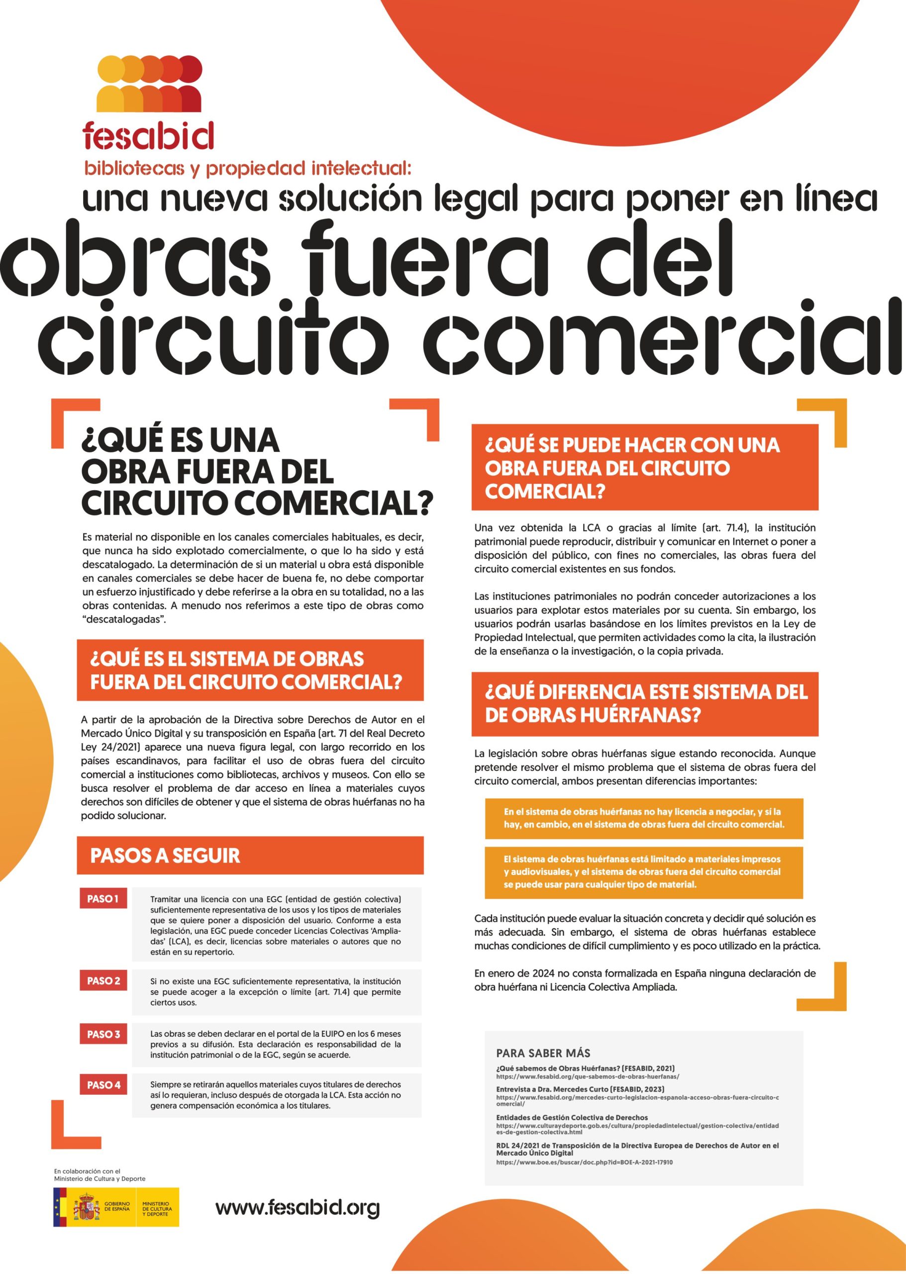 FESABID, la Federación Española de Sociedades de Archivística, Biblioteconomía, Documentación y Museística, ha lanzado una nueva infografía centrada en una nueva solución legal para las obras fuera del circuito comercial que se conservan en bibliotecas, archivos y museos de ámbito patrimonial: .